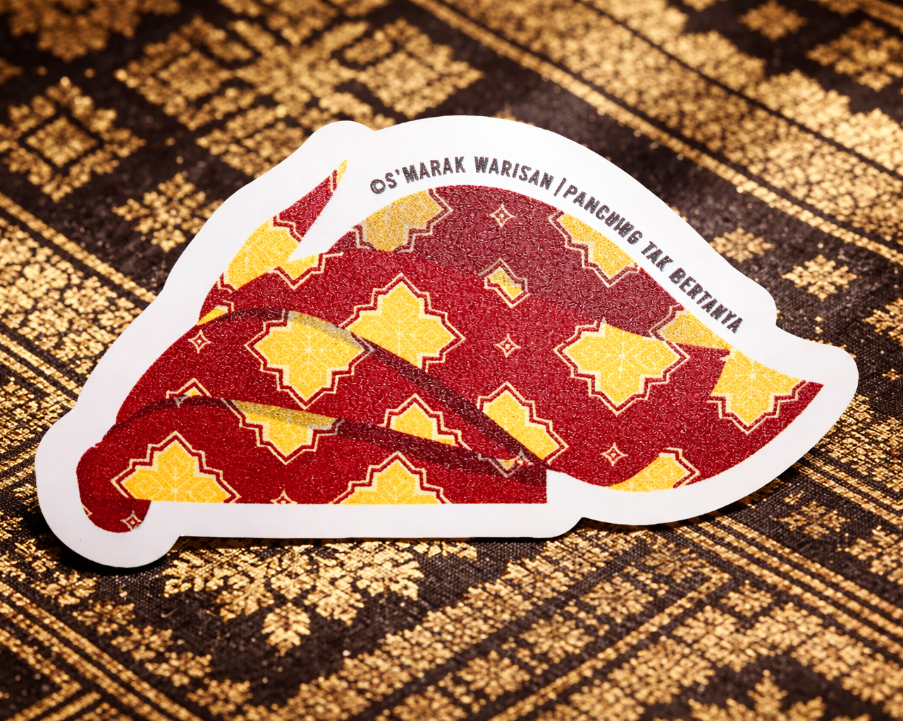 A matte sticker featuring the Pancung Tak Bertanya design. Finished with a weather-resistant, durable adhesive, making it suitable for laptops, bottles, and other smooth surfaces - it's a small piece of heritage you can carry anywhere!