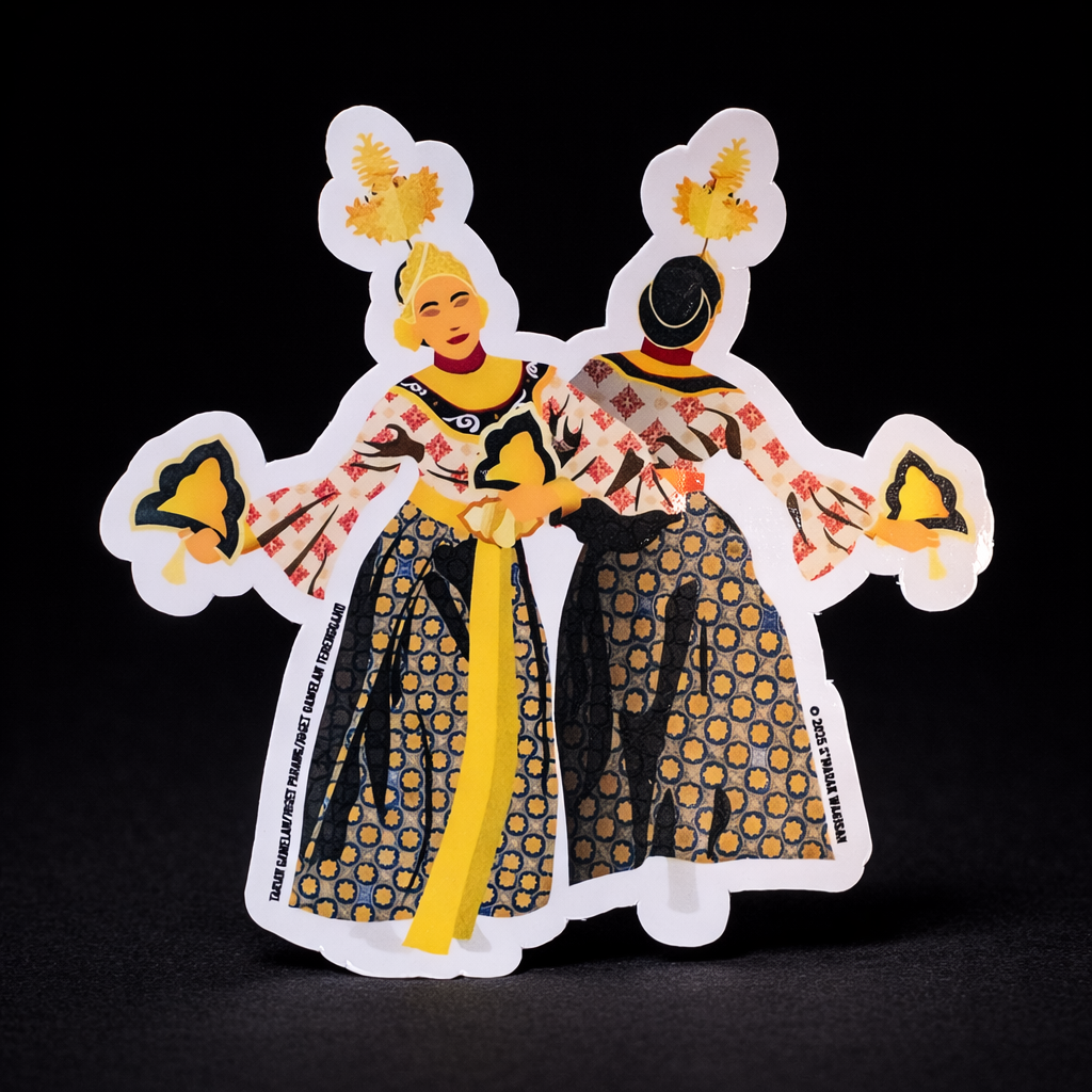 A glossy vinyl sticker featuring the traditional Tarian/Joget Gamelan design. Finished with a weather-resistant, durable adhesive, making it suitable for laptops, bottles, and other smooth surfaces.